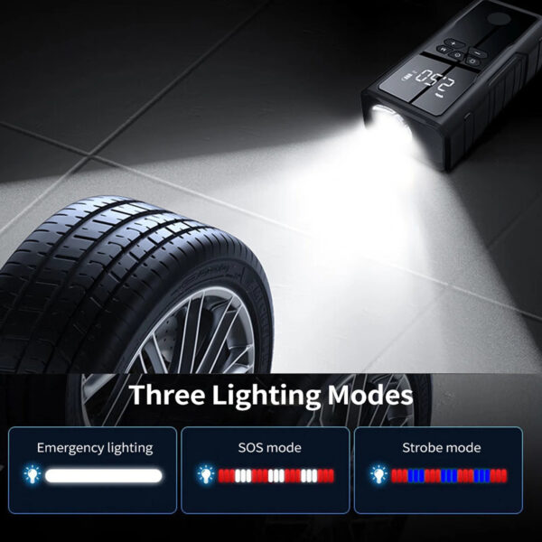 - Bright LED Emergency Light: The built-in LED flashlight offers multiple modes (steady, strobe, SOS) for night-time repairs, roadside emergencies, and power outages.