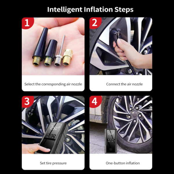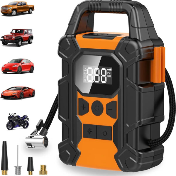 - Smart Wireless Digital Inflator: Features a 150PSI inflator with an LCD display screen that allows for easy pressure presetting, automatic shut-off, and accurate tire pressure monitoring. It includes 4 different nozzles and a detachable extended hose, making it versatile for inflating car tires, bikes, balls, and more.