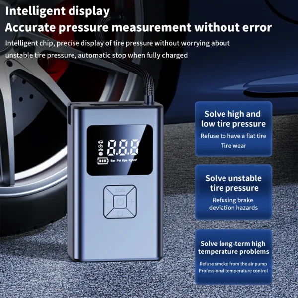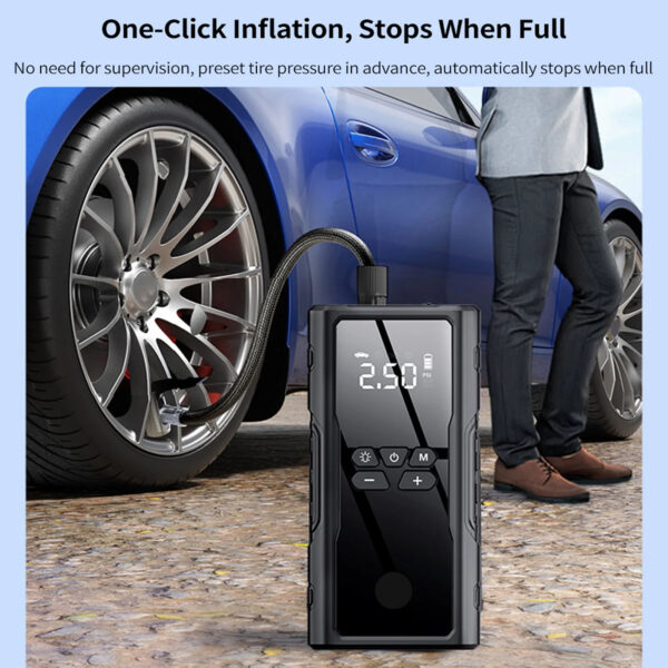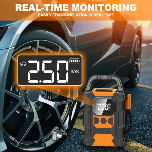 【Smart Auto Shut-Off】 The versatile car tire air pump seamlessly combines a pressure gauge with a preset function. This portable car air compressor accurately dispenses the desired air volume and automatically stops inflation when the tire pressure reaches the preset level. This ensures a secure, efficient, and reliable user experience.