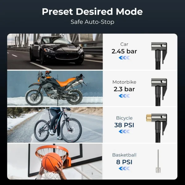 - Air Compressor for Tires: Equipped with 4 preset modes for bicycles, motorcycles, cars, and balls, it automatically shuts off once the preset pressure value is reached, ensuring easy operation. Additionally, you can manually set the pressure value up to 150PSI to cater to the inflation needs of more inflatable items.