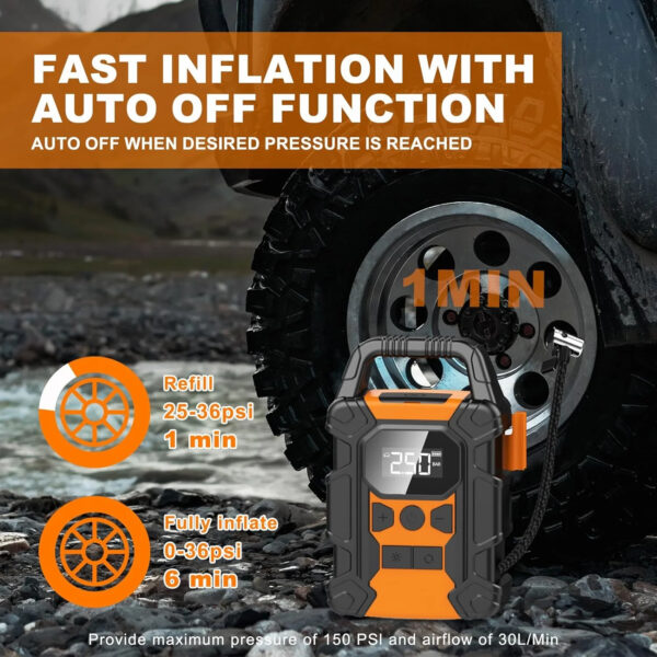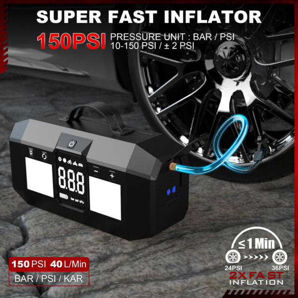 2x FASTER INFLATION: Portable Air Pump Will Have You Back on the Road in Minutes. The latest high-performance chip, can inflate objects with an amazing 150 PSI pressure and an rapid air flow of 36L/Min.
