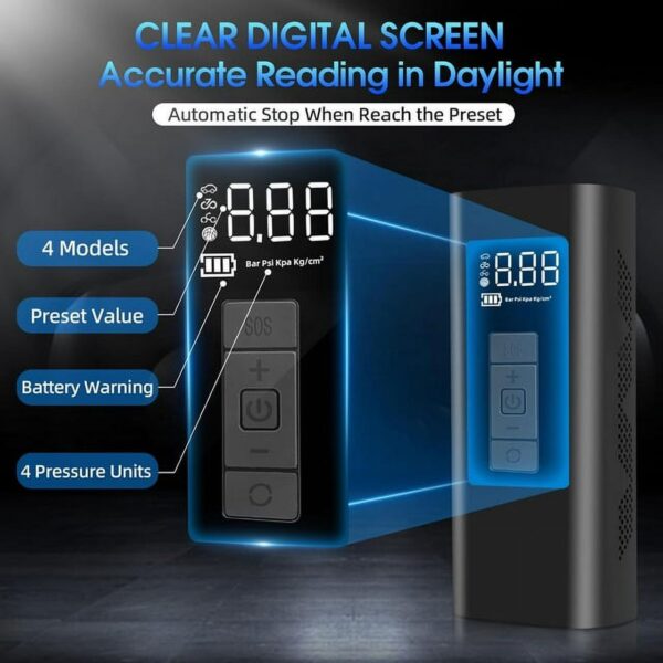 EASY TO READ: Dual LCD Screen with Auto Shutoff for a Guaranteed Safe Tire. Featuring Larger dual digital LCD screens, the tire pump displays real-time tire pressure and preset data. Easily preset and monitor tire pressure, and enjoy automatic shut-off once the set pressure is reached, eliminating concerns about over-inflating your tires.