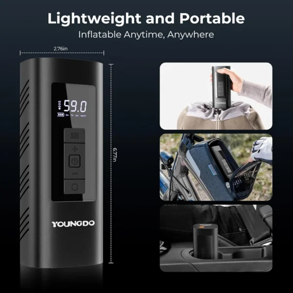 - Compact and Cordless Design: The cordless design and compact size make this air compressor easy to store in your trunk, backpack, or bike rack.