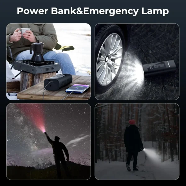 - Built-in Power Bank & Emergency Light: Beyond its primary function as a tire inflator, this device includes a 6000mAh battery that can charge your phone or other devices when needed.