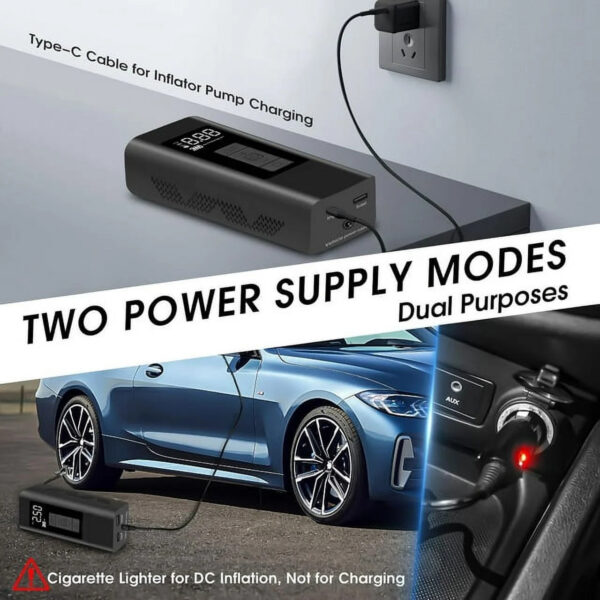 - [Dual Powered Design] - Portable air compressor can be switched between cordless and corded modes.12V DC power cord, connect to your car to power up easily. The included cigarette lighter can be connected to the car to provide current, which can help you complete the inflation function even when the outdoor inflation pump is low on power and weak.