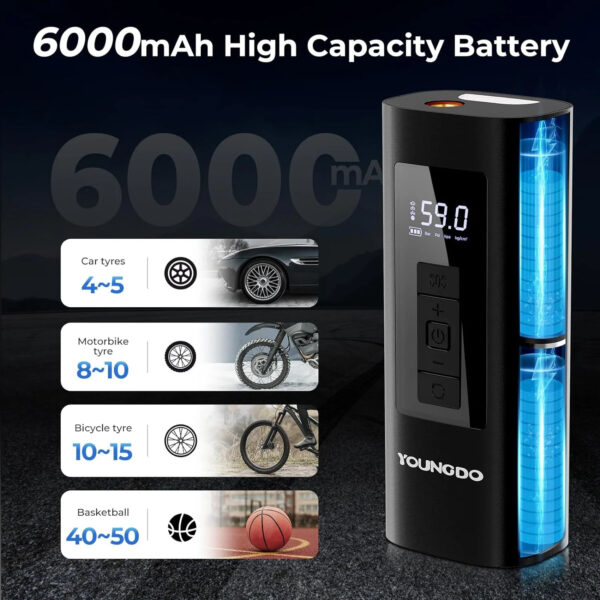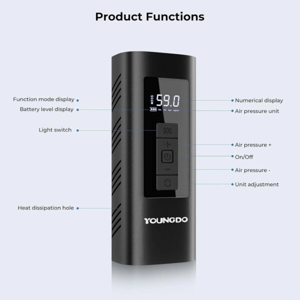 - 【One-Click Auto Operation 】The auto air pump offers 4 preset inflation modes ( bicycles, motorcycles, and balls) and 4 preset units (BAR, PSI, KPA, and KG/cm ²). With just one click, You can switch to any mode you need. Once reaching the preset pressure value, the YOUNGDO portable air compressor will automatically stop, giving you the freedom to relax and avoid checking it repeatedly.
