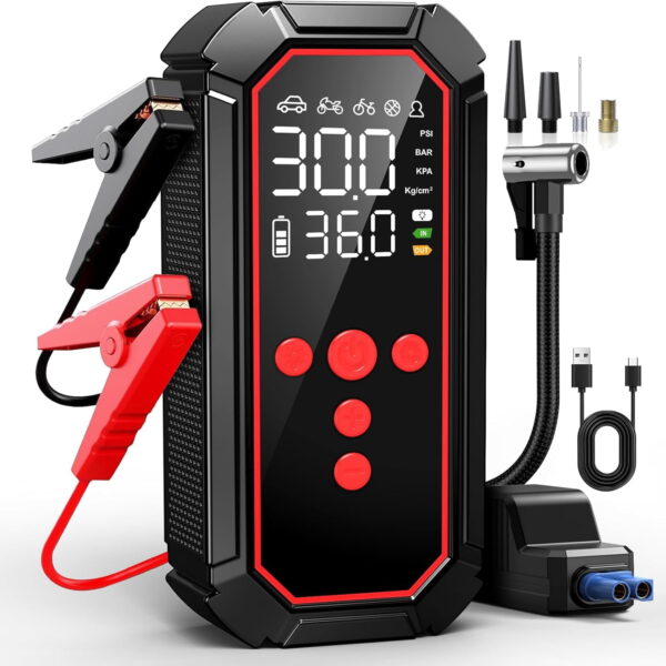 - 【Powerful Car Jump Starter & Inflator】: This portable car jump starter and inflator combo provides 6000A of power, capable of jump-starting your vehicle in emergency situations. With a 150PSI digital inflator, it can easily inflate tires, bikes, or balls. The built-in LCD display offers clear and precise tire pressure readings, ensuring safe and efficient inflation every time.