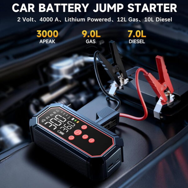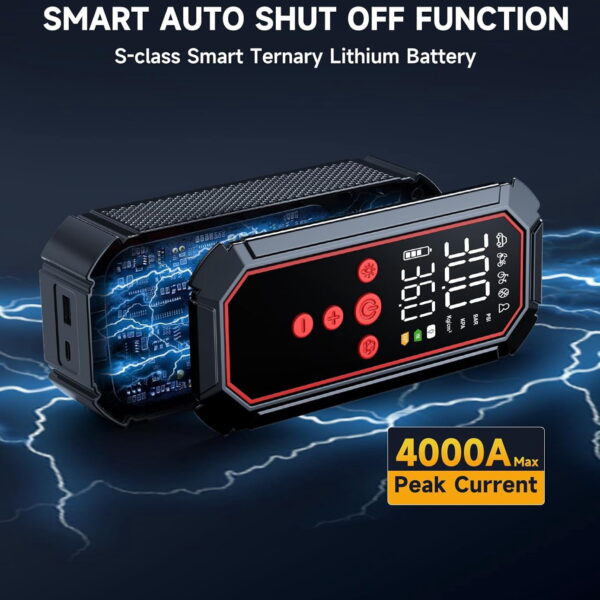 - 4000A Peak Power Jump Starter: Delivers 4000A peak current to start dead 12V car batteries in seconds, supporting up to 8.0L gasoline and 6.0L diesel engines. Perfect for cars, trucks, SUVs, motorcycles, and more, eliminating the need for roadside assistance.