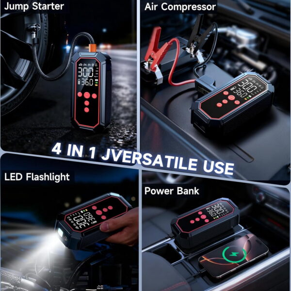 - 【4-IN-1 ULTIMATE ROADSIDE EMERGENCY KIT】Be prepared for any situation with this all-in-one car essential. Combining a powerful 12V jump starter, a high-speed tire inflator, a portable 8000mAh power bank, and a multi-mode LED flashlight, this compact device replaces bulky tools and provides complete peace of mind during breakdowns, road trips, or daily commutes.