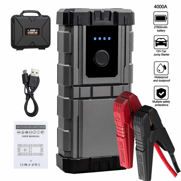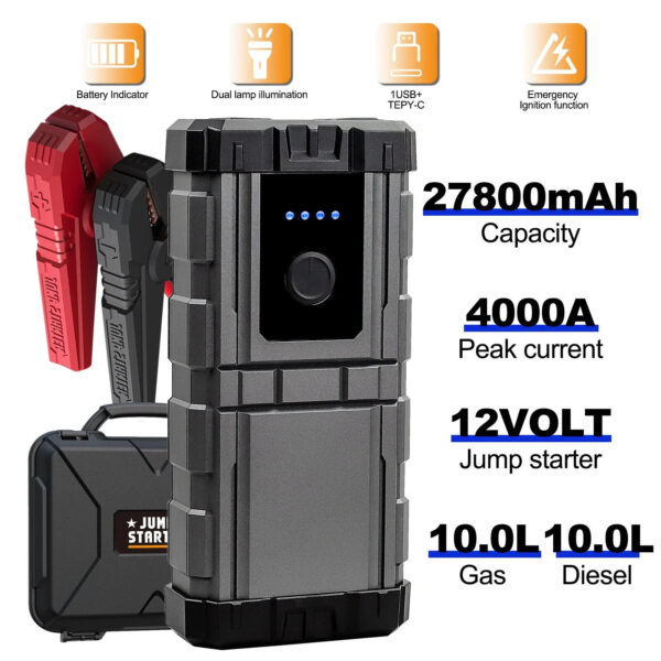 - Quick jump start: The latest Car Jump Starter has a peak current of 4000A and can quickly charge the batteries of cars and motorcycles.