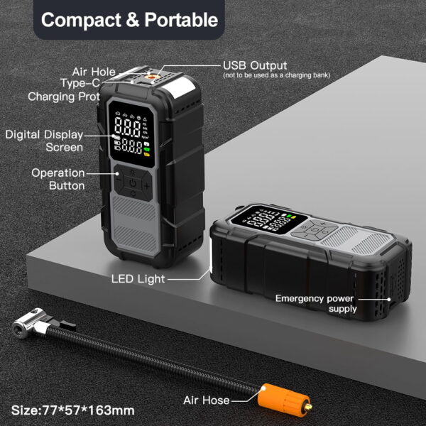 Compact, Rugged & User-Friendly Design Ultra-compact size (197×92×41mm) for easy storage in your glove box or center console. Features a durable, impact-resistant outer shell, IP65 waterproof rating, a clear LCD digital display (showing battery level), and a built-in LED light for night emergencies or roadside repairs.