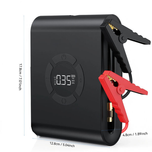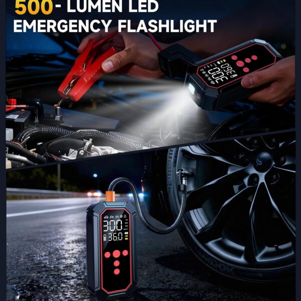 - 【INTEGRATED SMART TIRE INFLATOR】A jump starter with an air compressor, this unit makes maintaining tire pressure effortless. Whether it’s a car tire, bicycle, or sports ball, the included air hose and precise inflation technology get the job done quickly. Its portable design allows you to check and top off your tires anywhere, improving safety and fuel efficiency on the road.