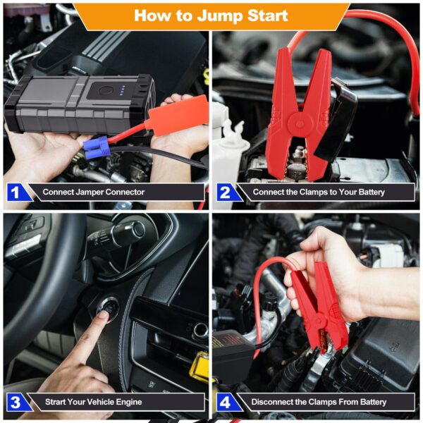 - 【HOW TO JUMP START 】Our starter is simple to operate, the first step only requires the insertion of Intelligent Jumper Cables into the booster; The second step is to connect the clamp to the car battery, red is the positive battery (+), black is the negative battery (-); Step 3 When the indicator light comes on, start the car; Step 4 Within 30 seconds after starting, remove the clamp from the car battery. The operation is very simple and convenient.