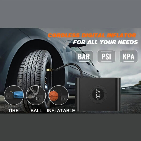 - 🌬️ 150PSI Digital Tire Inflator with Auto-Shutoff Equipped with a high-efficiency air compressor and an easy-to-read large LCD screen. It supports 4 pressure units (BAR/PSI/kPa) and features 4 preset modes (Car/Motorcycle/Bicycle/Ball). Simply set your desired pressure, and it will automatically stop inflating to prevent overfilling, perfect for quickly fixing flat tires on the go.