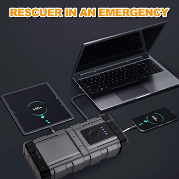 - 1、Can charge for mobile phones and laptops, cars‑start, with adjustable LED lights (flashlight, strobe lights and SOS lights).