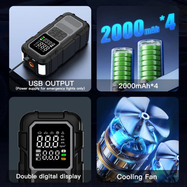 - Multifunctional Emergency Kit: This kit combines a car jumper starter portable, portable tire inflator, real-time tire pressure monitoring, and a 20000mAh high-capacity power bank with a USB-C interface for fast charging of mobile phones, tablets, or digital cameras. It also offers three lighting modes (flashlight, strobe, and SOS).