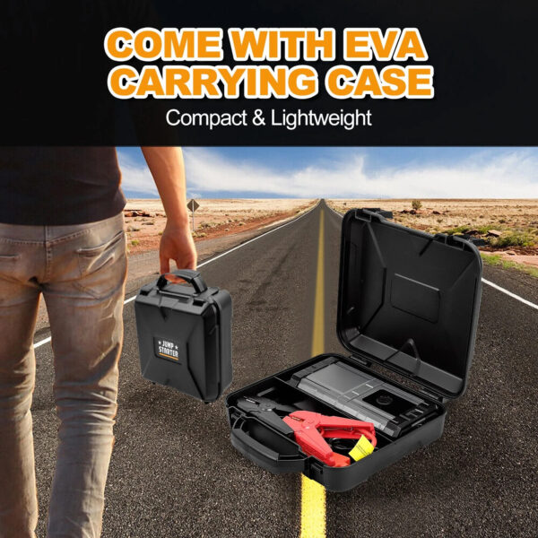 Emergency & Versatile Utility More than just a jump starter! The bright LED light with multiple modes (flashlight, strobe, SOS) provides visibility and safety in dark or emergency situations. The compact, lightweight design makes it perfect for daily commutes, road trips, camping, and long-distance travels, ensuring you’re never stranded.