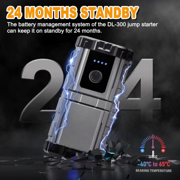 - 【-DJ-300 JUM STAETER SYSTEM-】The battery starter uses the DJ-300 JUM STAETER system with excellent electrical conductivity and heavy duty jumpers for 24 hours of premium standby. It works even at extreme temperatures of -40°C to 65°C (-4 to 140 ° F) and supports 1000+ charge cycles. With about 24 months of standby power.