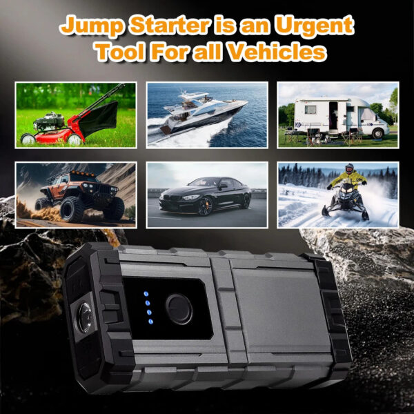 - Jump Starter with Air Compressor instantly jumpstart a battery with 3000A cranking power, start all 12V vehicles (up to 9.0 L gas and 8.0 L diesel engine). It's universal compatible with cars, trucks, motorcycles, lawnmowers, SUV, snowmobiles, boats.