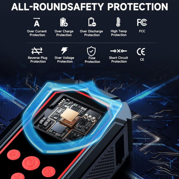 - Smart Safety Protection: Features upgraded smart chips with multi-layer safety protections including over-current, over-voltage, short-circuit, and reverse-polarity protection, ensuring safe and reliable jump starts every time.