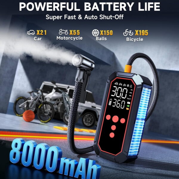 ✅ Multi-Mode Presets for Fast Inflation: One-click inflation with built-in presets for cars, motorcycles, bicycles, and balls. Inflate a standard car tire in just 60 seconds, a motorcycle tire in 45 seconds, and a bike tire in 30 seconds, with automatic shut-off once the target pressure is reached.
