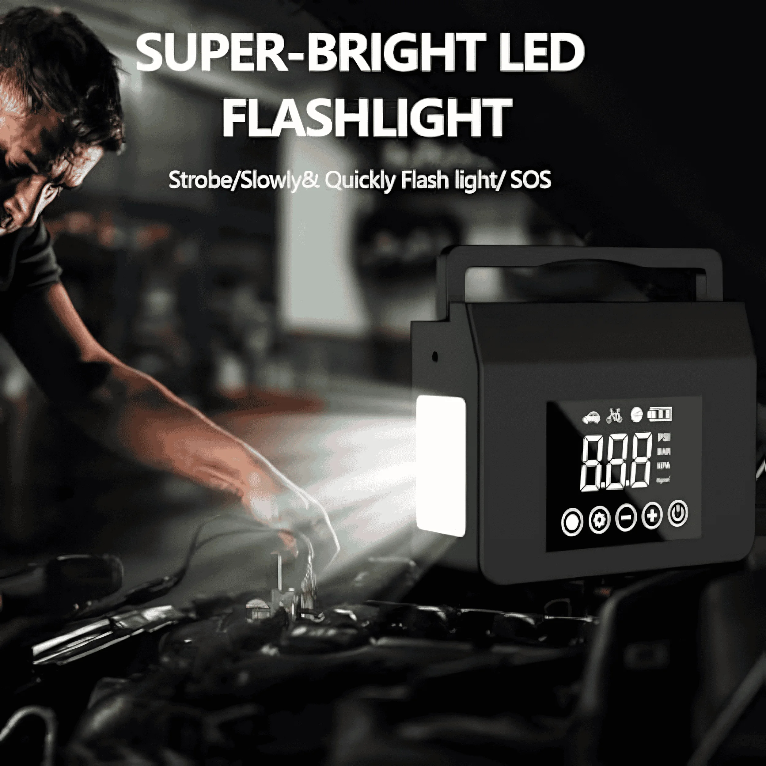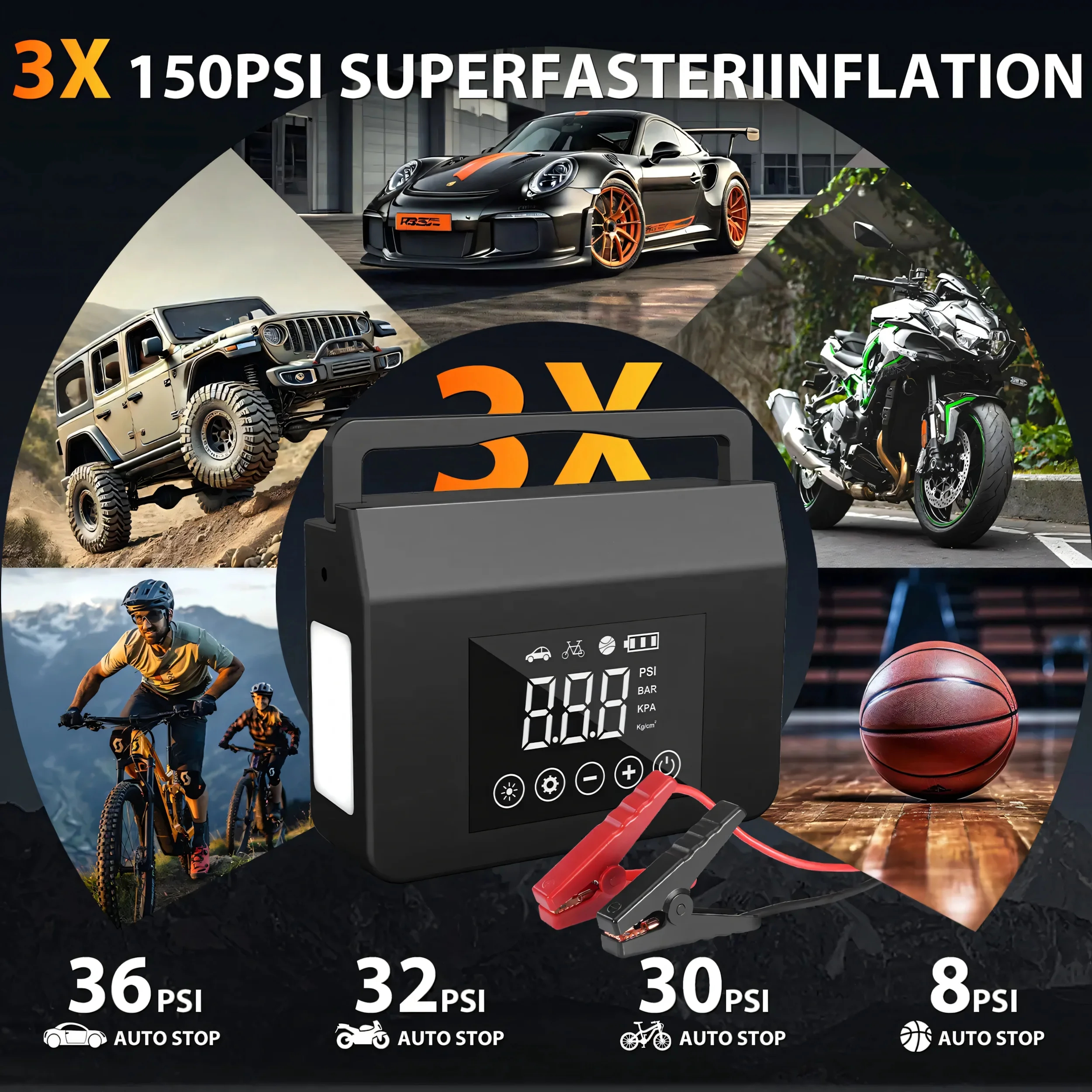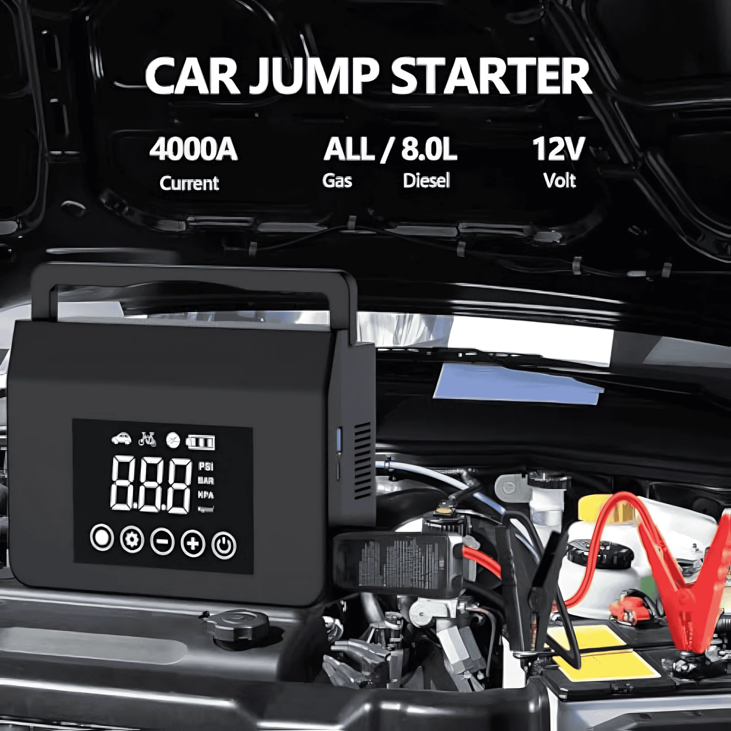 This 4000A car jump starter with a portable air compressor is a versatile tool for your vehicle and home. It can quickly start cars, trucks, motorcycles, lawn mowers, and ships, while also inflating tires up to 150 PSI with its 35L/min airflow. Featuring a digital tire pressure gauge, LED lighting, and SOS emergency lighting, it is designed for convenience and safety.