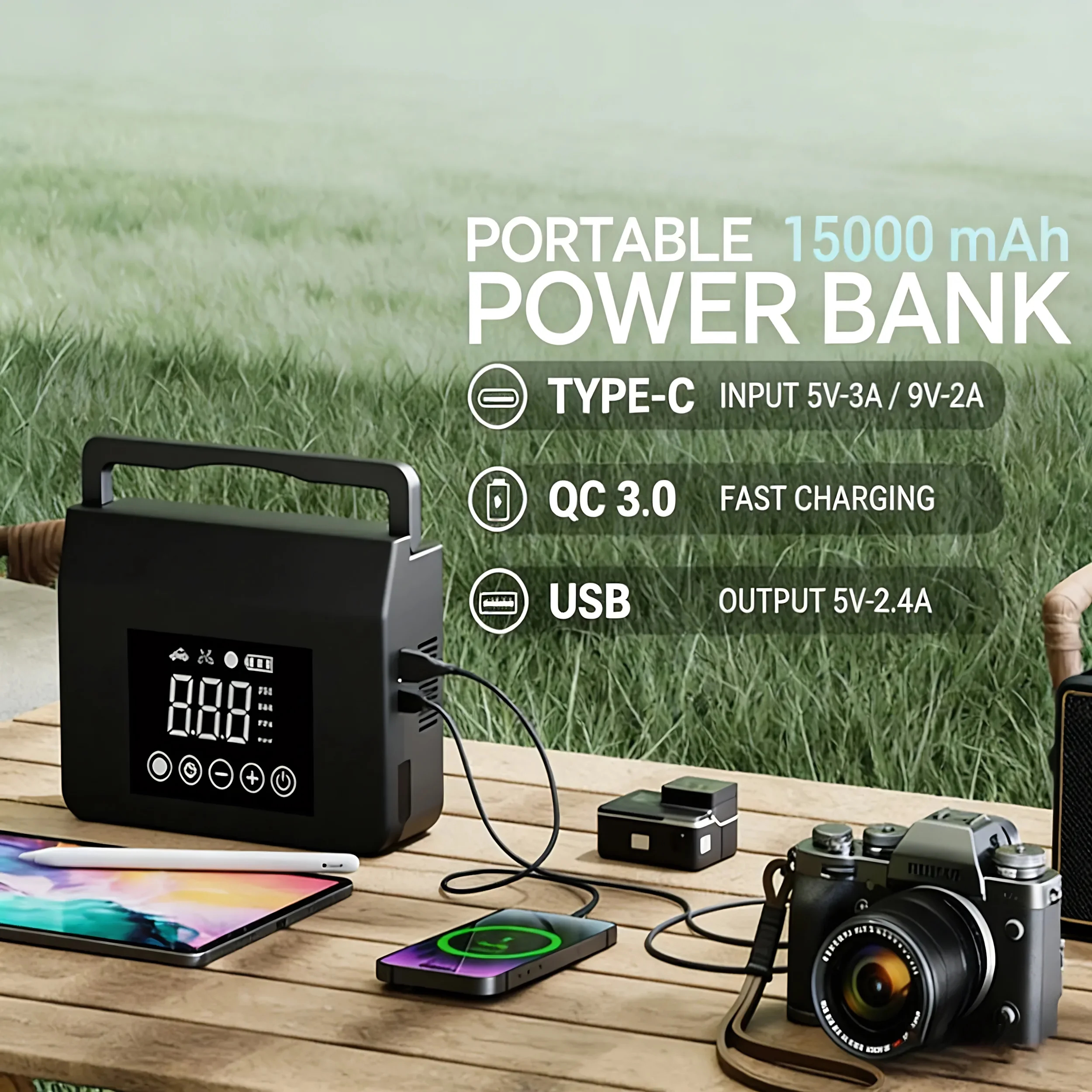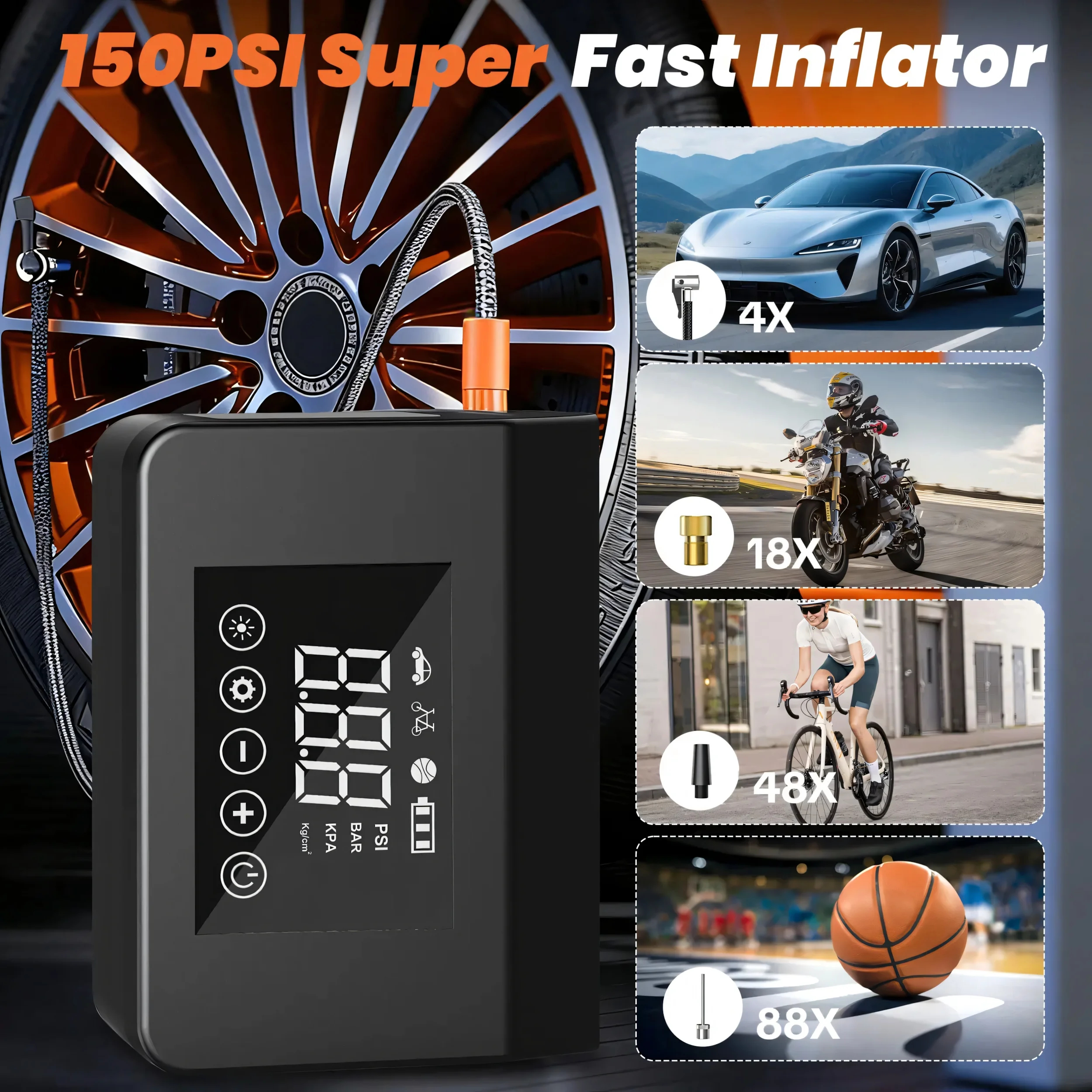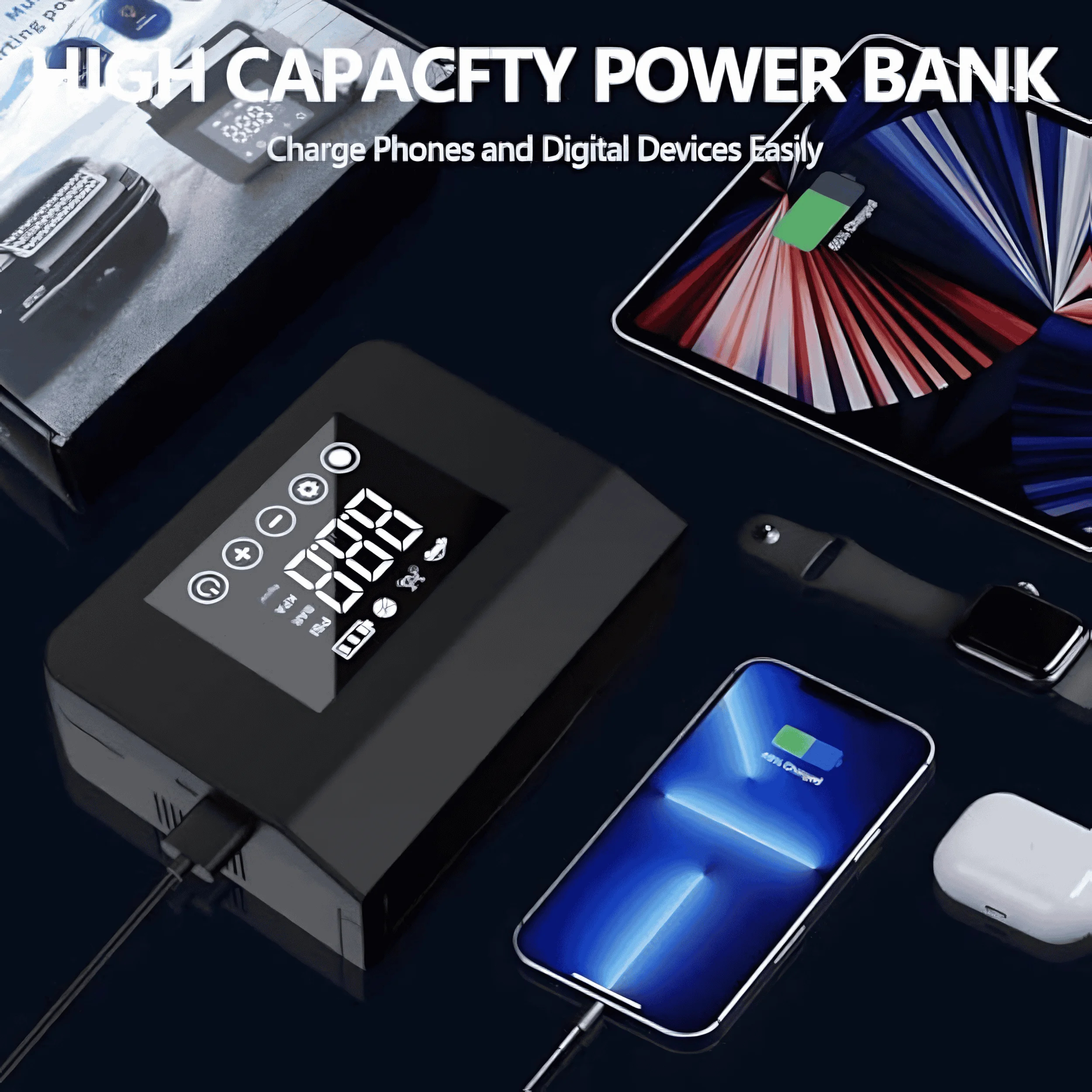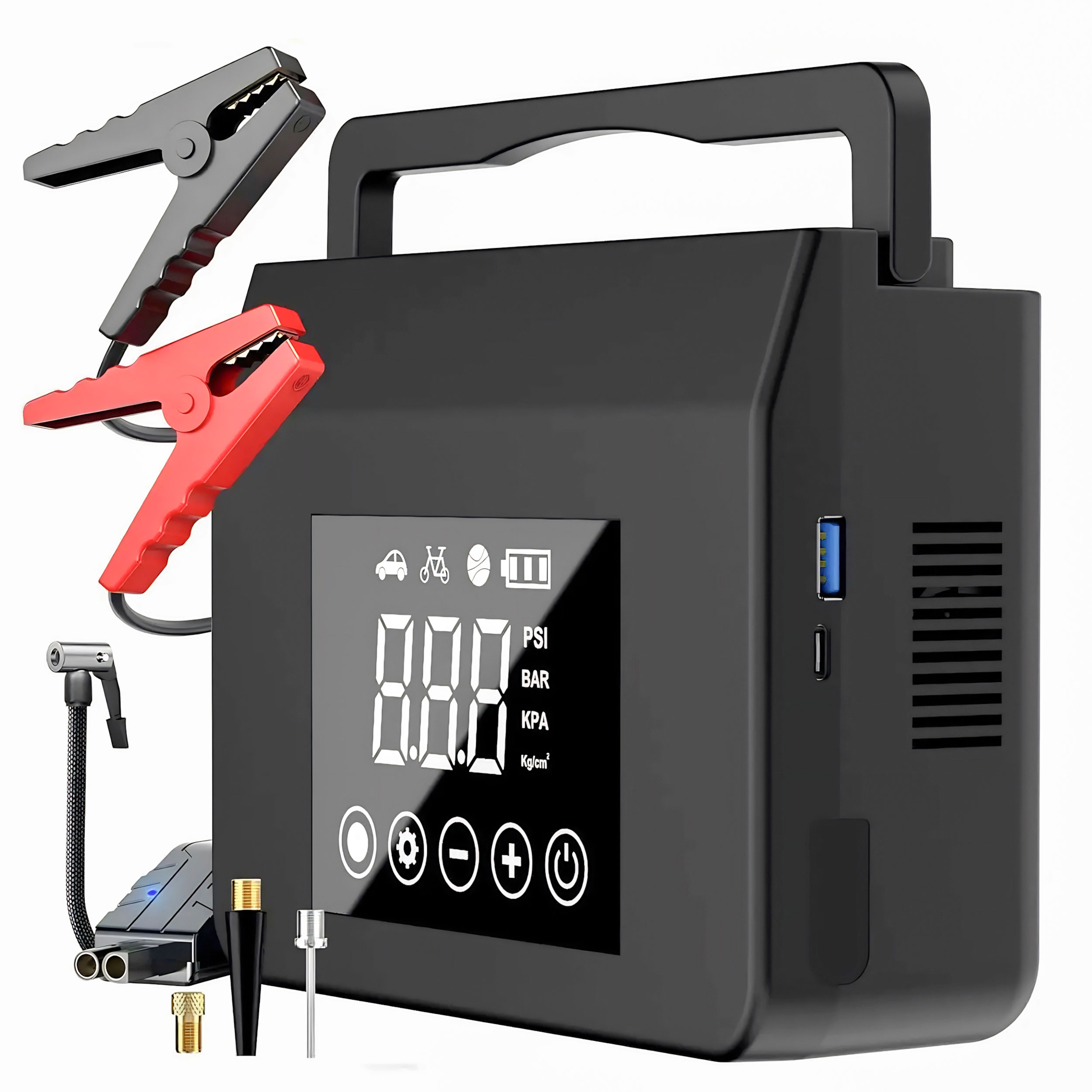 This 4000A car jump starter with a portable air compressor is a versatile tool for your vehicle and home. It can quickly start cars, trucks, motorcycles, lawn mowers, and ships, while also inflating tires up to 150 PSI with its 35L/min airflow. Featuring a digital tire pressure gauge, LED lighting, and SOS emergency lighting, it is designed for convenience and safety.
