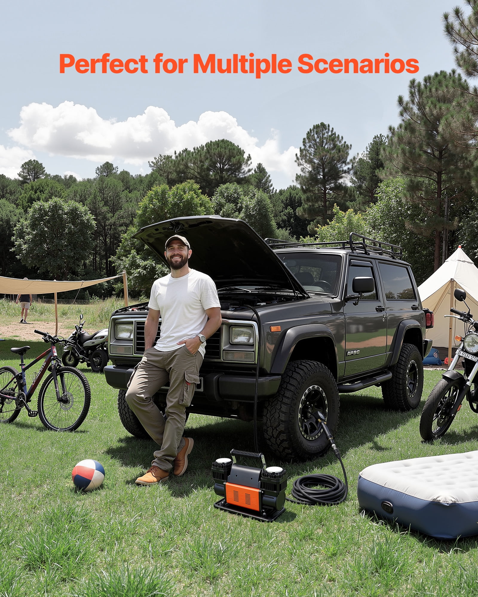 Equipped with inflation adapters, this portable air compressor is versatile for cars, SUVs, trucks, and RVs, while also suitable for motorcycles, bicycles, sports balls, inflatable toys, air mattresses, and more.