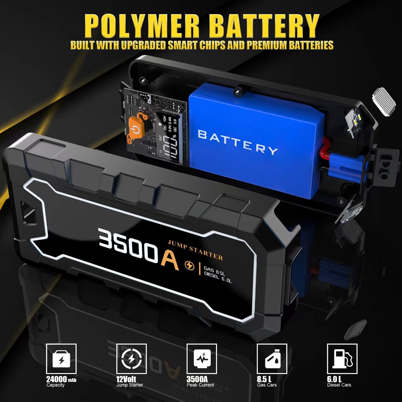 Delivers 3500A peak current, powerful enough to jump start 12V dead batteries (up to 8.5L gasoline or 6.0L diesel engines) in seconds. Works for cars, trucks, SUVs, motorcycles, boats, and more—ideal for emergency roadside assistance.