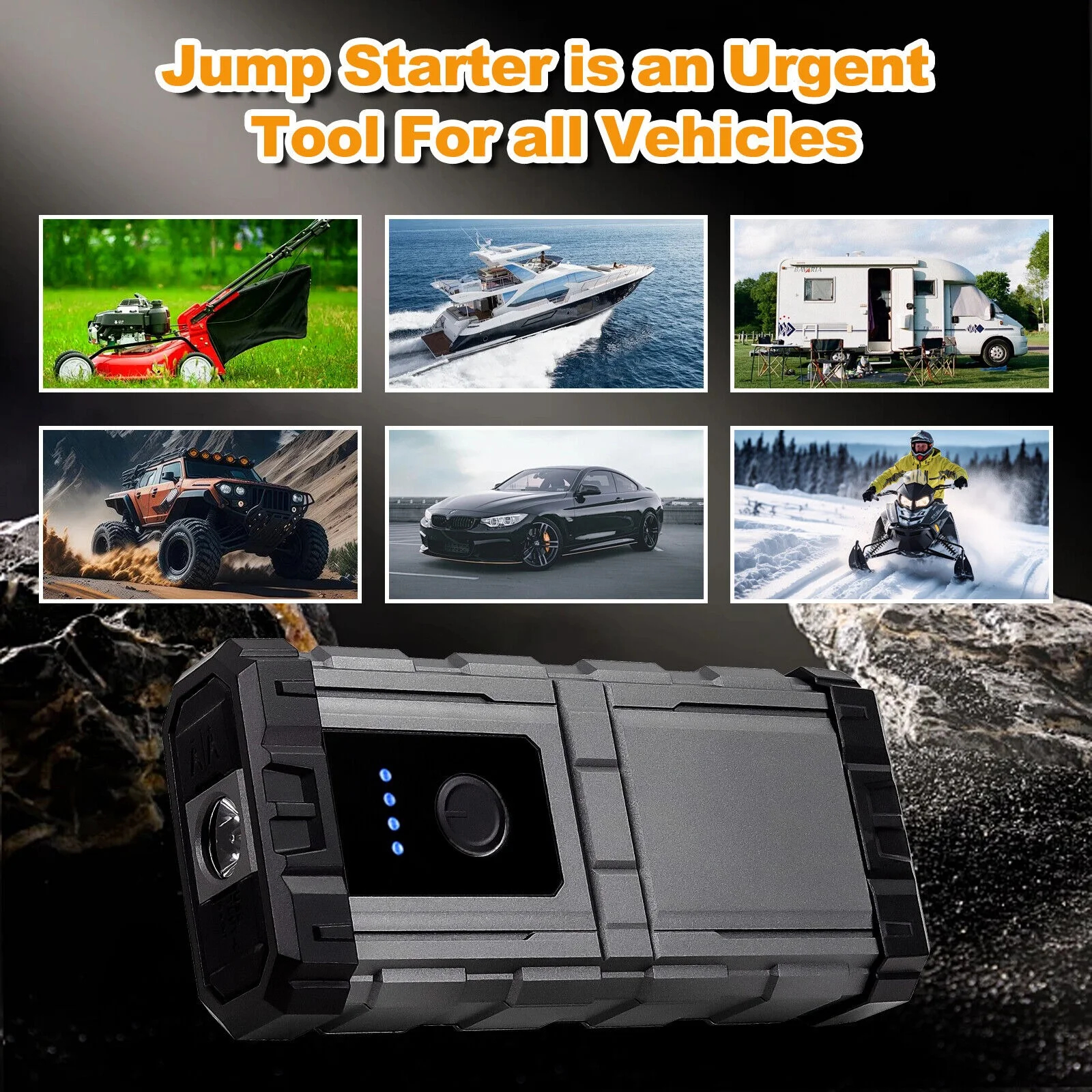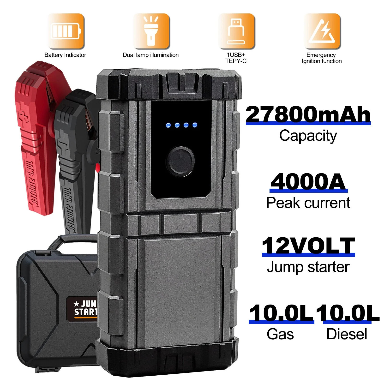 With 4000Amp peak current this jump starter can start the car with a dead battery in seconds, up to 60 times with a single charge. Even if the battery voltage is too low (below 9V).Our jump starter battery pack can start up to 10-liter diesel and 10.0-liter gasoline engines, it is suitable for trucks, motorcycles, snowmobiles, ATVs, UTVs, and lawnmowers.