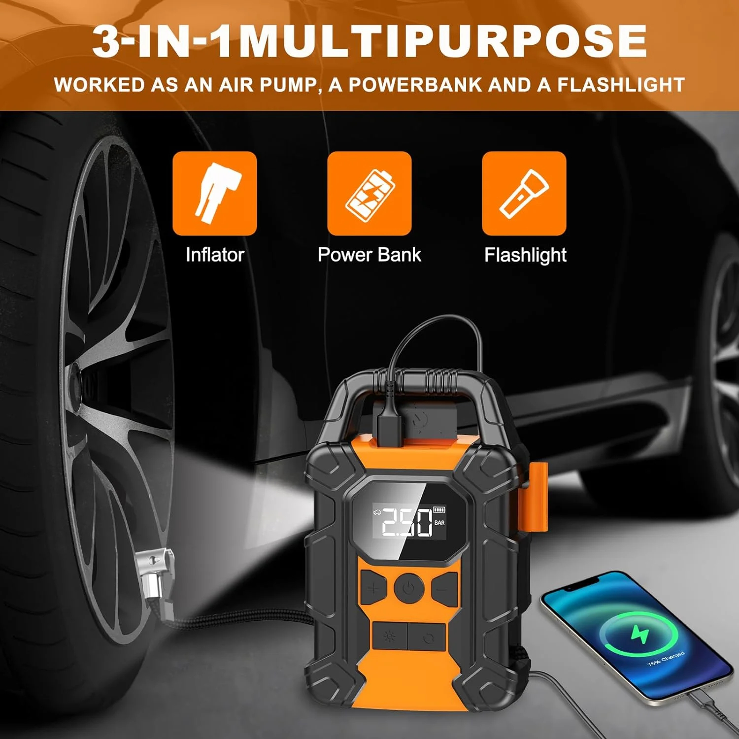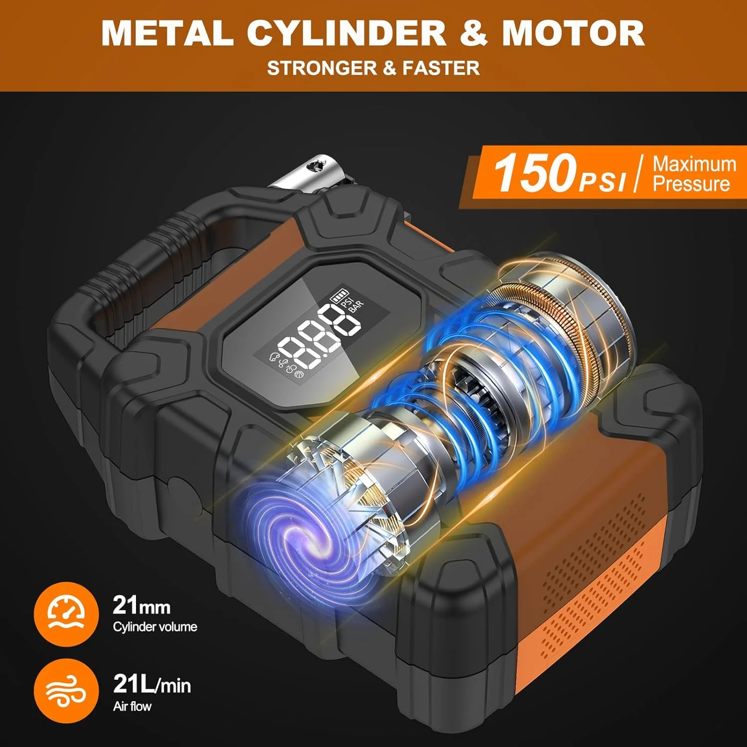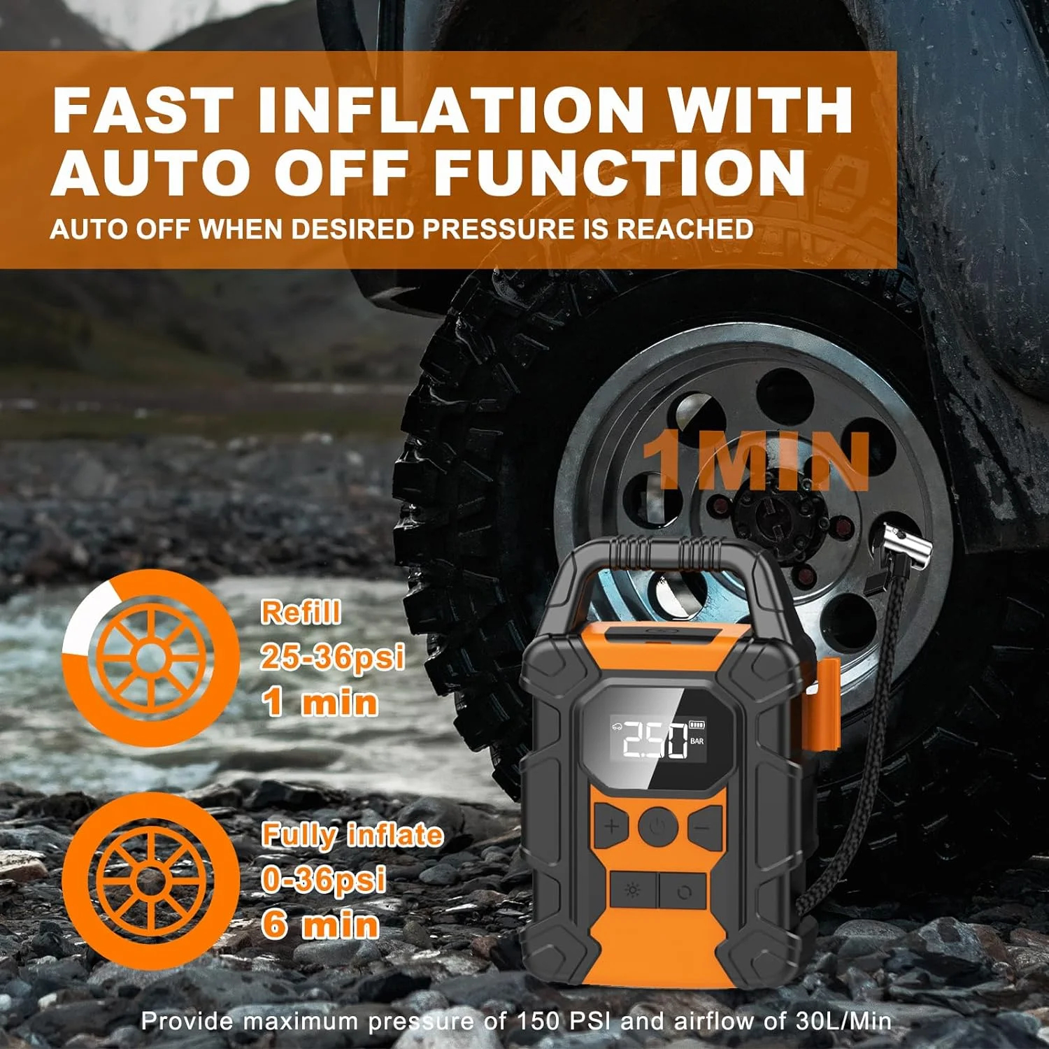 Its cordless design ensures on-the-go inflation convenience. Empowered by a high-performance chip, it achieves 150 psi pressure with rapid inflation. The LED digital display provides accurate readings, while the auto-shutoff feature prevents over-inflation. Smart auto shut-off ensures safe, efficient, and worry-free operation.