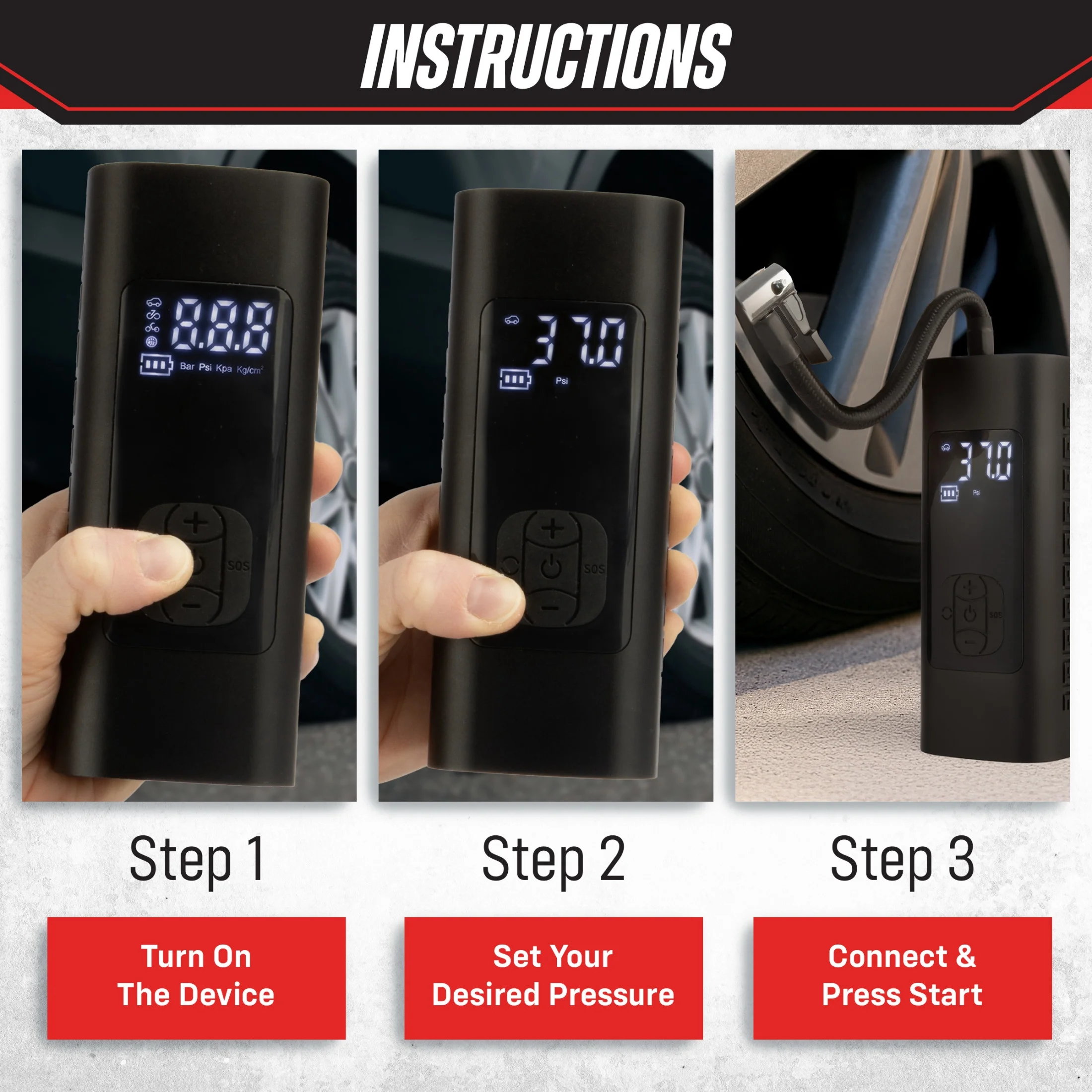 Easily inflate car tires, basketballs, bicycle tires, and more with the Air Compressor Portable Tire Inflator . This multifunctional air tire pump for car portable tire pressure gauge with inflator also has a built-in LED light ideal for late night emergency fill ups and doubles as a power source for your electronic devices, with C-type and USB charging ports. With 4 preset inflation modes and an auto-off feature, this car and bike tire pump is quick and easy to use, inflating quickly and accurately up to 150 PSI. Use this airpump for cars, SUVs, pickup trucks, balls, and bikes, with a high-speed airflow and an easy-to-read digital display screen that shows real-time pressure values in 4 units. The tire air compressor includes a 39” USB-C charging cable, 10ft car charger, 5.9” air hose, 2 inflation attachments, ball inflation needle, and bike converter head.