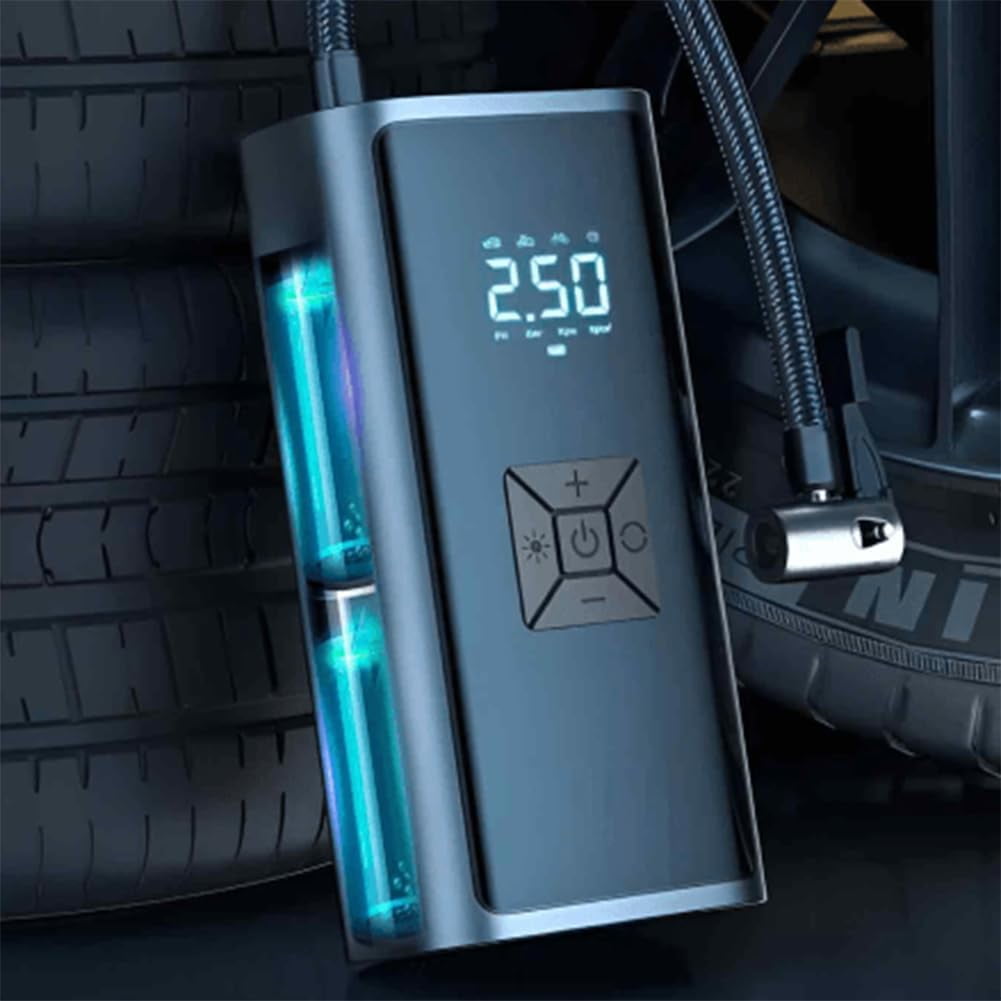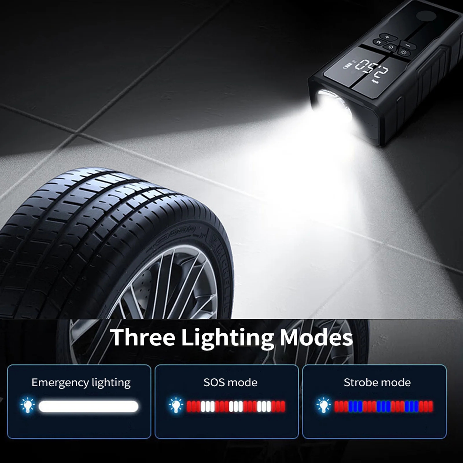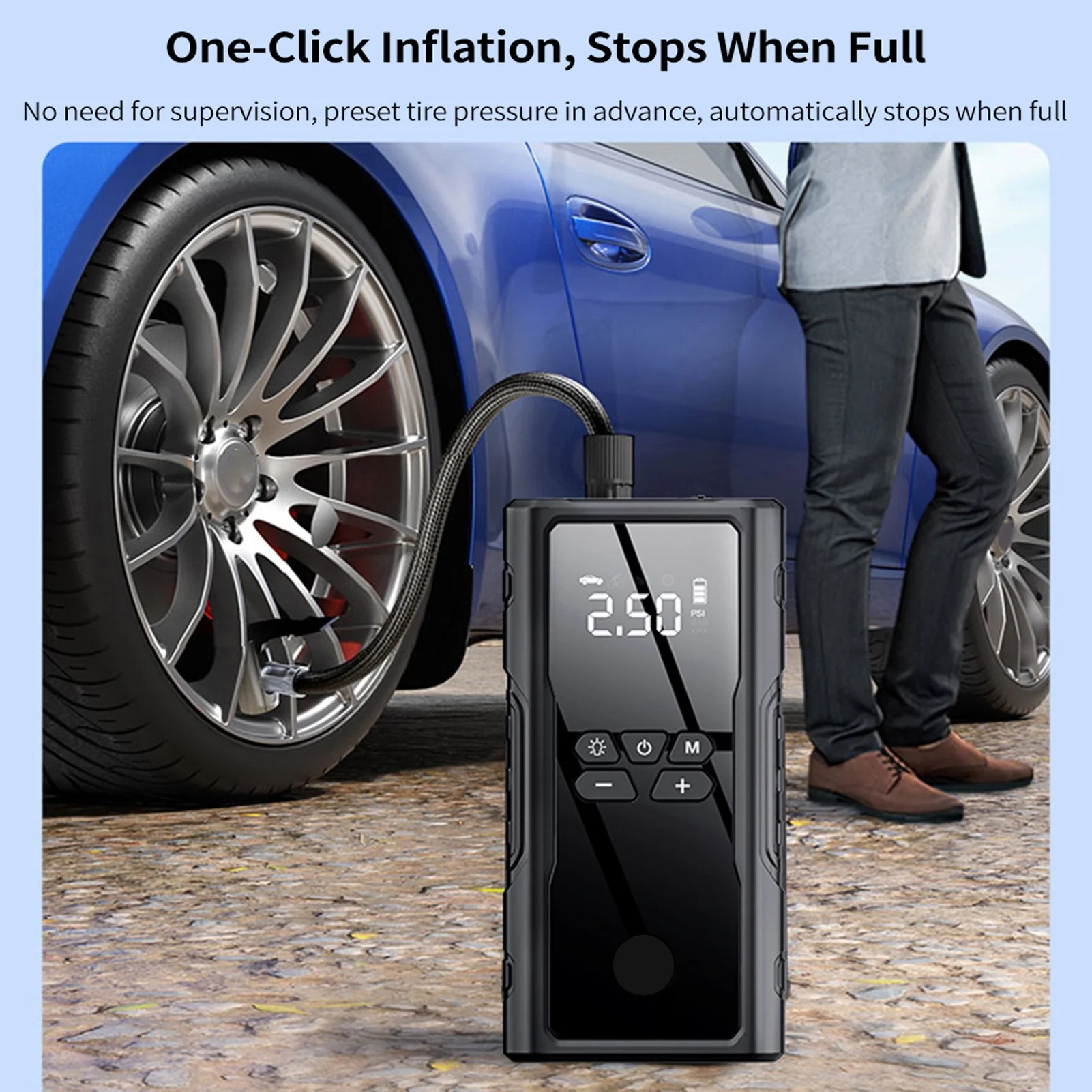 150PSI Smart Wireless Digital Inflator:Easy to use, smart preset, pressure detection & auto shut off. The portable car jump starters with tire Inflator LCD Display Screen Intelligent Digital display, which can clearly and accurately display tire pressure,4 different nozzles and and detachable extended hose for inflating cars, bikes, balls, etc.